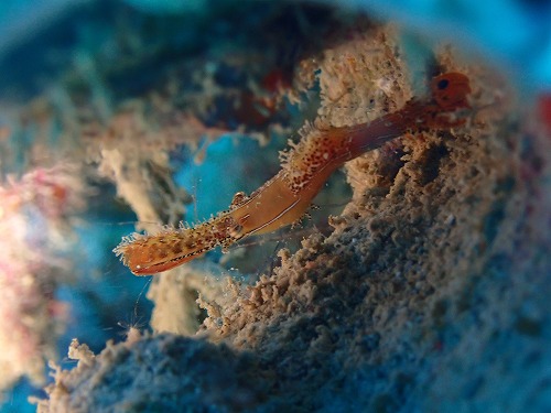 よーく見ると赤いエビが写真中央付近に張り付いているのが見えますね!
