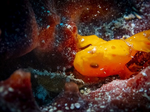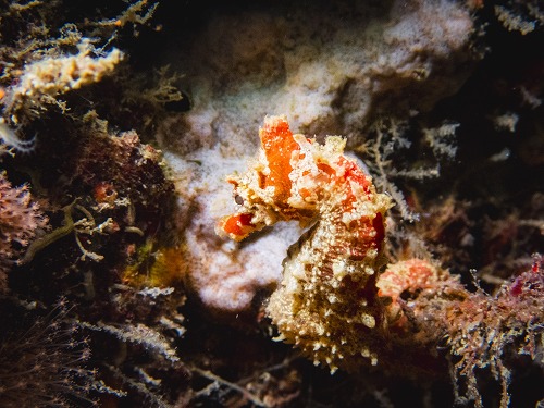 オレンジのカエルアンコウがピタッと水底にはりついていました