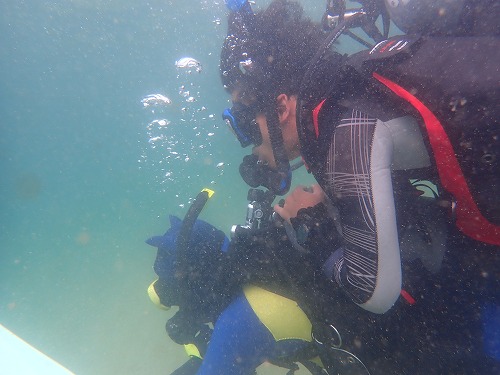 K様はウエットスーツでの中性浮力の練習と基本スキルの再確認を行い
